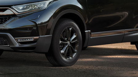 Nærbillede af parkeret CR-V Plug-in Hybrid SUV's hjul og side med model. Nærbillede af parkeret CR-V Plug-in Hybrid SUV's hjul og side med model.